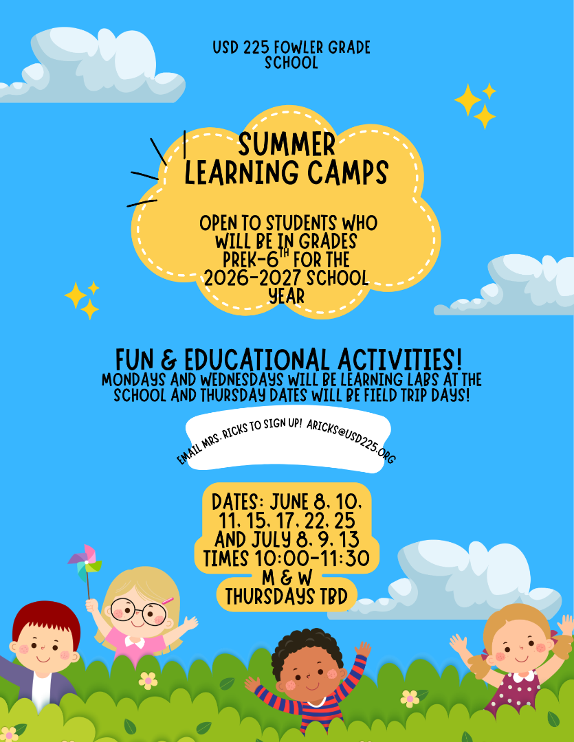 USD 225 Fowler Grade School is excited to announce our Summer Learning Camps. These camps will be held on specific Mondays and Wednesdays during the months of June and July. The camps are open to any students who will be entering grades PREK-6th grade for the 2026-2027 school year. The camps are open to any students who are Residents of Fowler and students that currently attend Fowler Grade School. Camp times for Mondays and Wednesdays will be 10:00am--11:30am. Lunch will be served at 11:30 for students wishing to stay and eat. Thursday are going to be "take a trip Thursday". We will have various field trips planned and times will be adjusted accordingly.